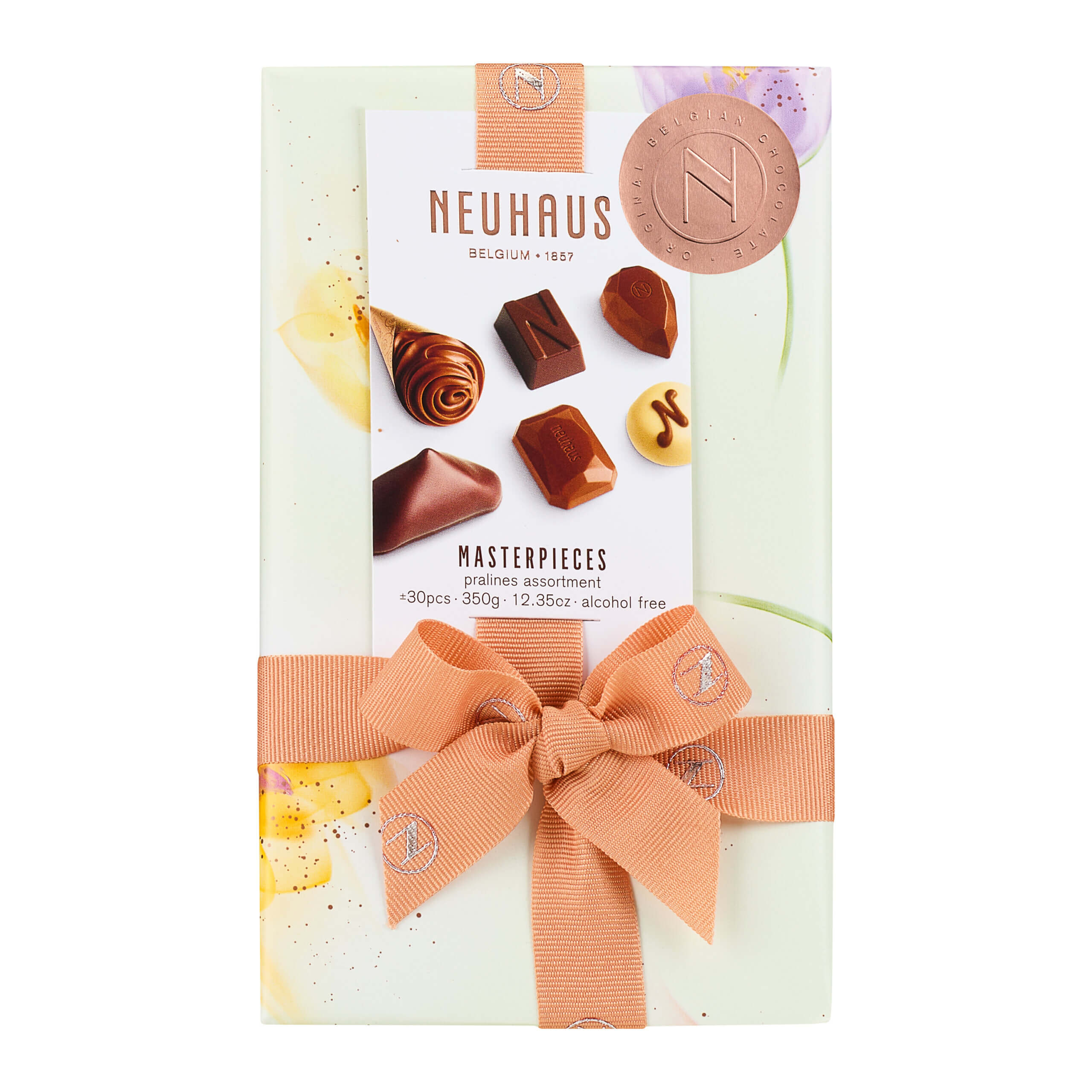 Szeroki asortyment czekoladek, pralinek oraz trufli Neuhaus w wiosennym opakowaniu.