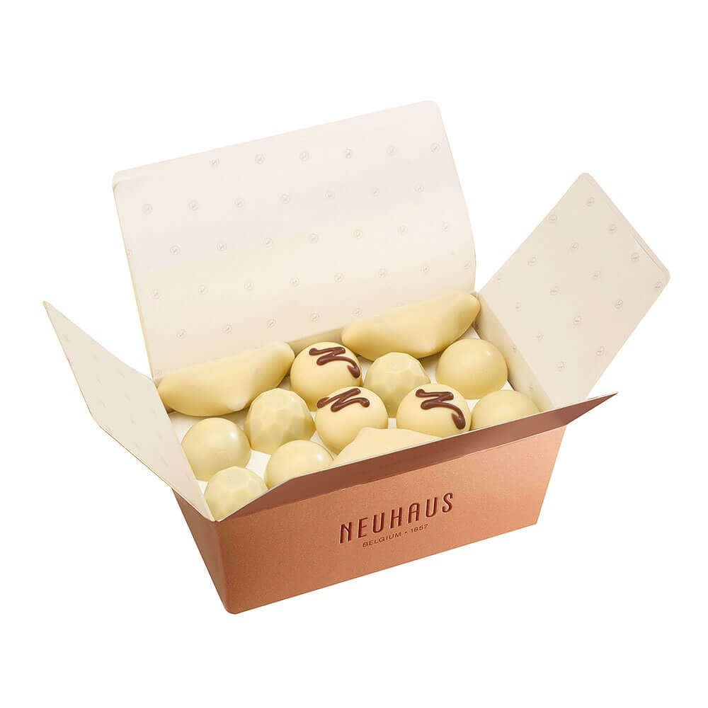 biala czekolada (cukier, tluszcz kakaowy, pelne MLEKO w proszku, emulgator: lecytyna SOJOWA, aromaty), cukier, ORZECHY LASKOWE, masło (MLEKO), miazga kakaowa, tluszcz kakaowy, pelne MLEKO w proszku, syrop glukozowy, maka ryzowa, woda, stabilizator: sorbitole z pszenicy, ORZECHY PEKAN, kawa, aromaty, emulgator: lecytyna SOJOWA; MASLO KLAROWANE (MLEKO), MIGDALY, stabilizator: glicerol z nasion rzepaku, stabilizator: sorbitole kukurydziane, sol, wanilia, syrop cukru inwertowanego, kwas: kwas cytrynowy; cukier karmelizowany.