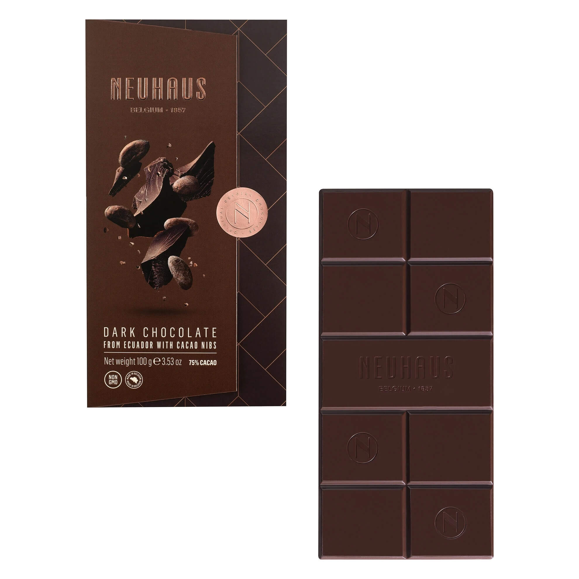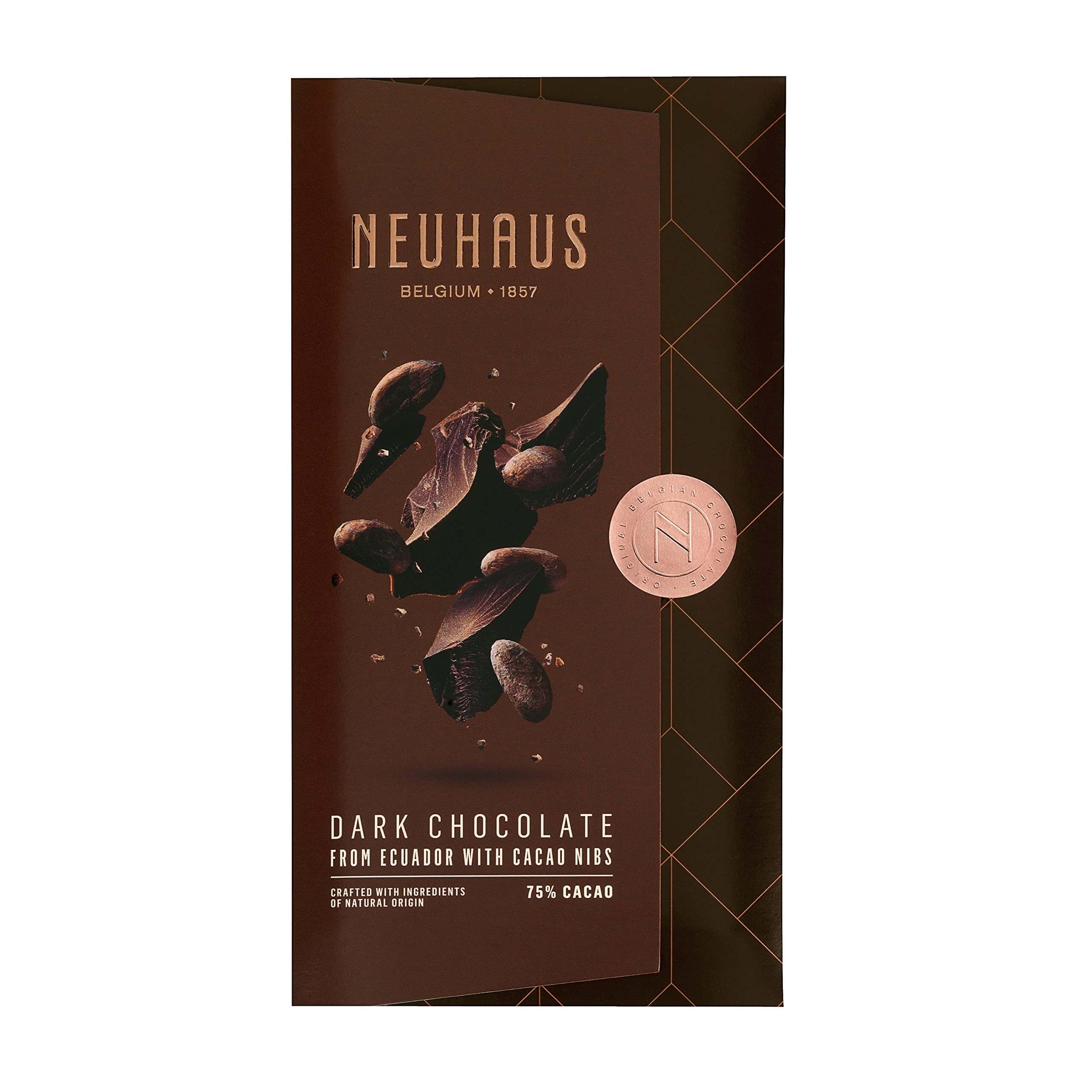 Intensywna ciemna czekolada zawierająca 75% kakao z dodatkiem kruszonych ziaren kakaowca.