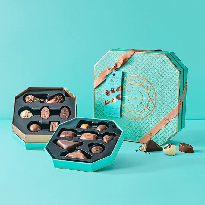 mleczna czekolada (cukier, pełne mleko w proszku, masa kakaowa, tłuszcz kakaowy, emulgator: lecytyna sojowa, aromat), gorzka czekolada (masa kakaowa, cukier, masło klarowane (mleko), tłuszcz kakaowy, emulgator: lecytyny sojowa, aromat), gianduja (cukier, orzechy laskowe, tłuszcz kakaowy, masa kakaowa, pełne mleko w proszku, emulgator: lecytyny sojowa, masło klarowane (mleko), aromat), cukier, biała czekolada (cukier, tłuszcz kakaowy, pełne mleko w proszku, emulgator: lecytyny sojowa, aromat), orzechy laskowe, syrop glukozowy, masło (mleko), śmietanka (mleko), masa kakaowa, stabilizator: sorbitol; tłuszcz kakaowy, substancja utrzymująca wilgoć: glicerol; migdały, masło klarowane (mleko), tłuszcz kokosowy, masło shea, miód, syrop z cukru kandyzowanego, syrop z cukru inwertowanego, pasta migdałowa, mąka pszenna, kakao w proszku, odtłuszczone mleko, woda, kawa, pełne mleko w proszku, malina, jabłko puree, aromaty, karmelizowany cukier, olej słonecznikowy, emulgator: lecytyna sojowa; syrop cukrowy, jaja, sól, wanilia, przyprawy, substancja spulchniająca: węglany amonu, difosforan disodowy, wodorowęglany sodu; cynamon, sól (Guérande), kwas: kwas cytrynowy; barwnik: ekstrakt z papryki; skrobia pszenna.
