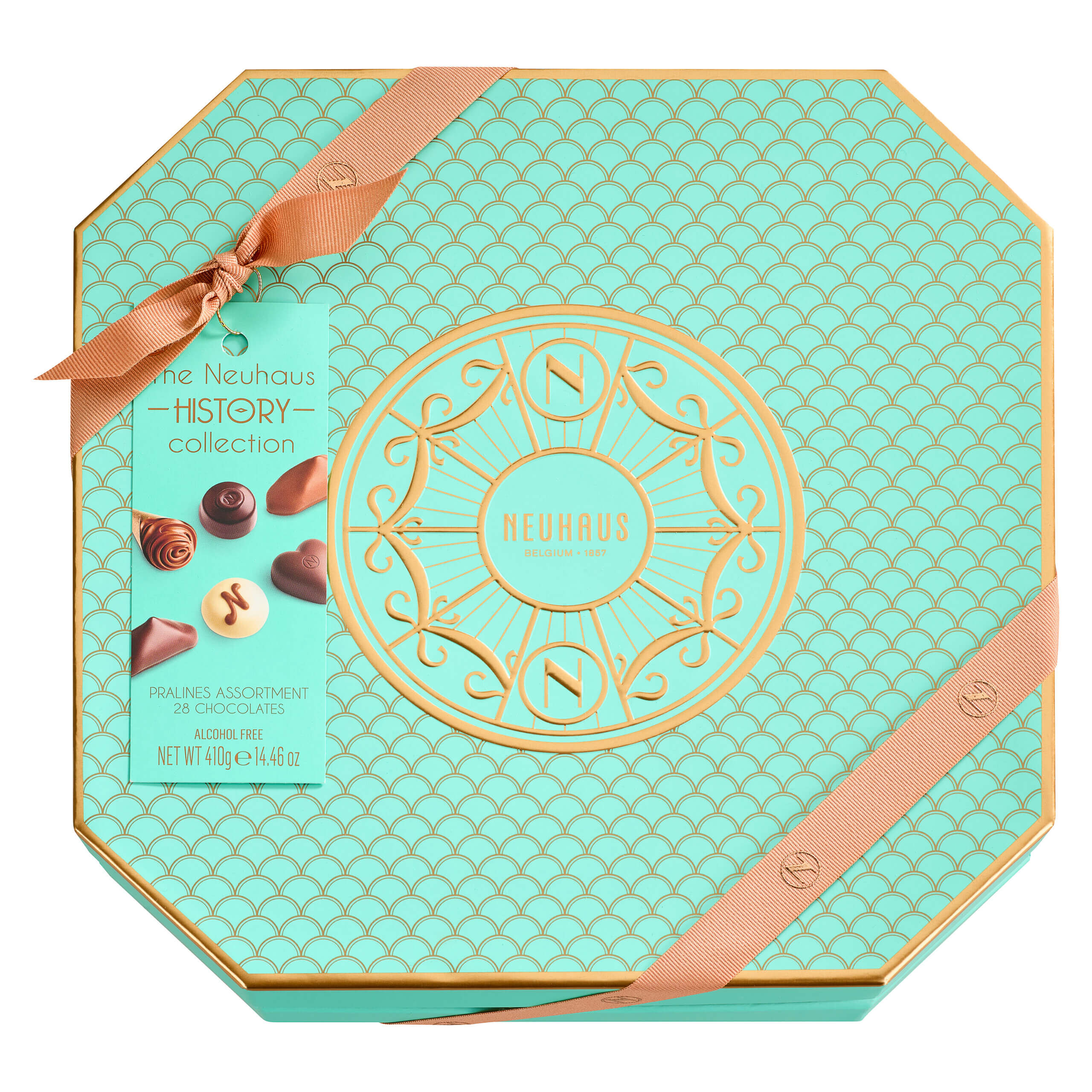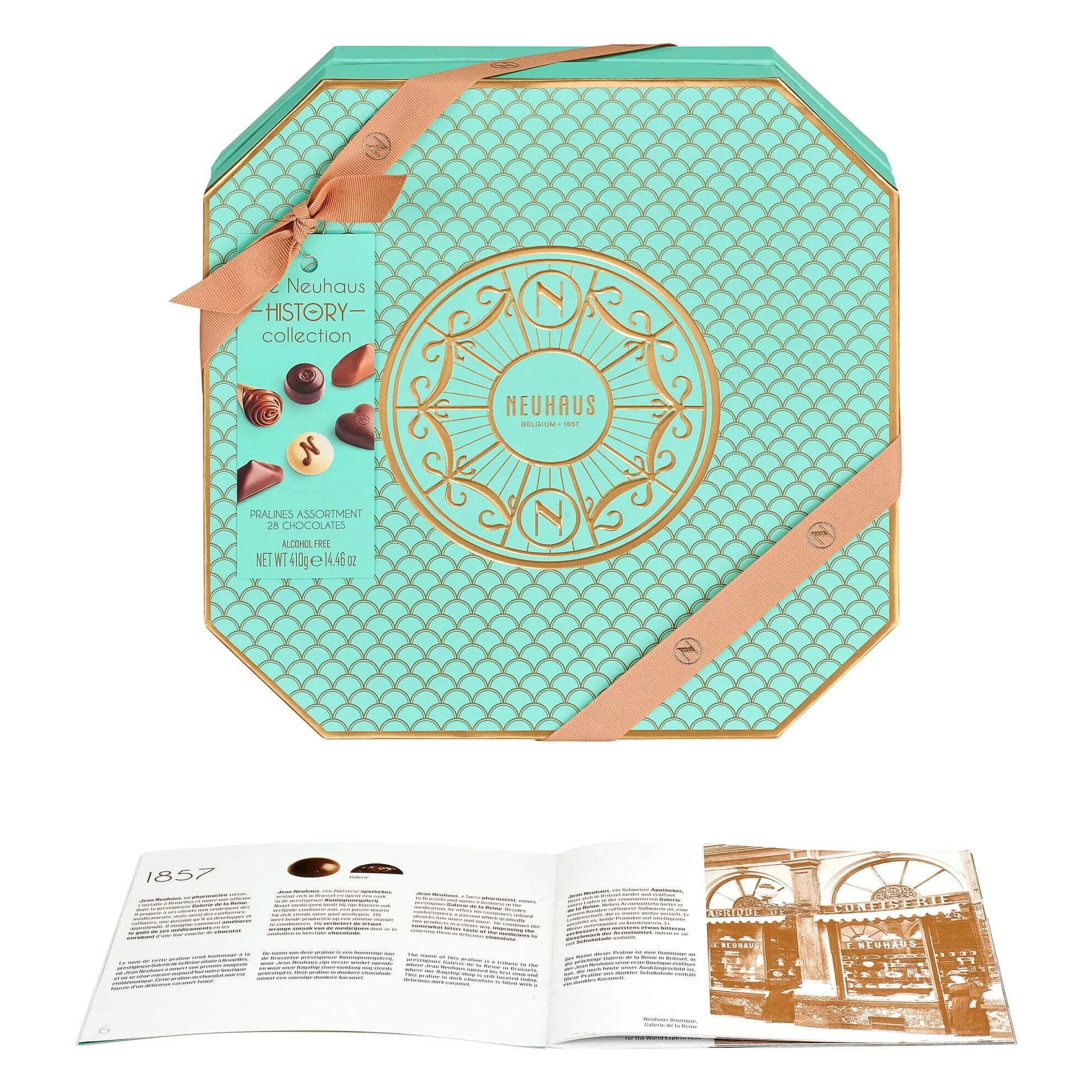 Nadszedł czas, aby opowiedzieć historię czekoladek Neuhaus. Najprzyjemniejszy sposób przypomnienia o pokoleniach czekoladek powstałych w Neuhaus, jest piękne pudełko z bogatym wyborem najbardziej znanych czekoladowych kreacji! Pudełko zawiera 2 warstwy, każda z 14 pysznymi arcydziełami oraz broszurą zawierającą bogatą historię Neuhaus.