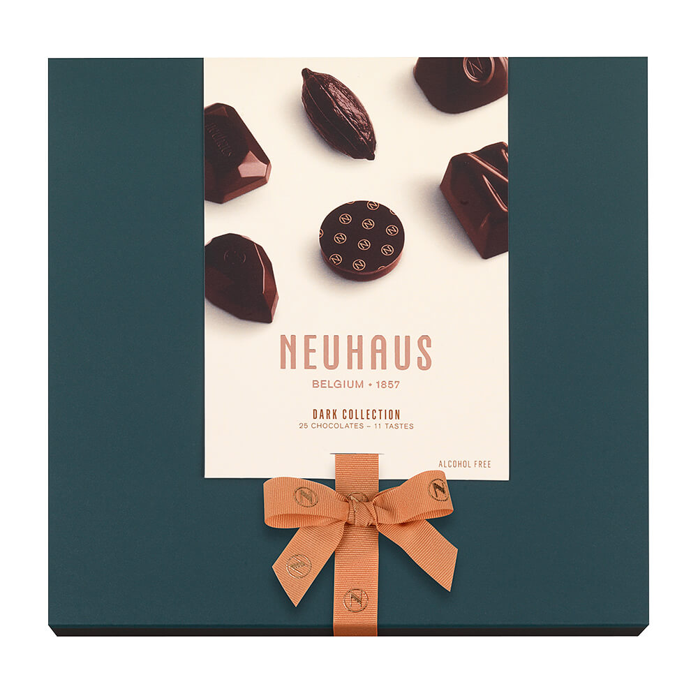 Kolekcja ciemnych czekoladek Neuhaus. Asortyment 25 ponadczasowych czekoladek Neuhaus został starannie dobrany w celu zademonstrowania kunsztu oryginalnych belgijskich czekoladek. Czekoladki ciemne od 56 do 70% kakao, wypełnione między innymi nadzieniem pralinowym, ganache, karmelem, są elegancko eksponowane we współczesnym, kolorowym i eleganckim opakowaniu. Idealny pomysł na prezent dla miłośnika czekolady ciemnej. Kolor pudełka może różnić się w zależności od sezonu